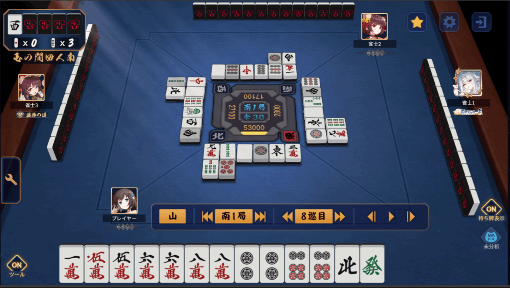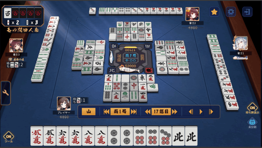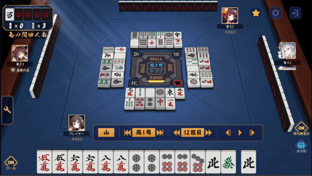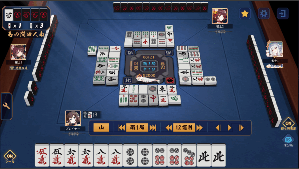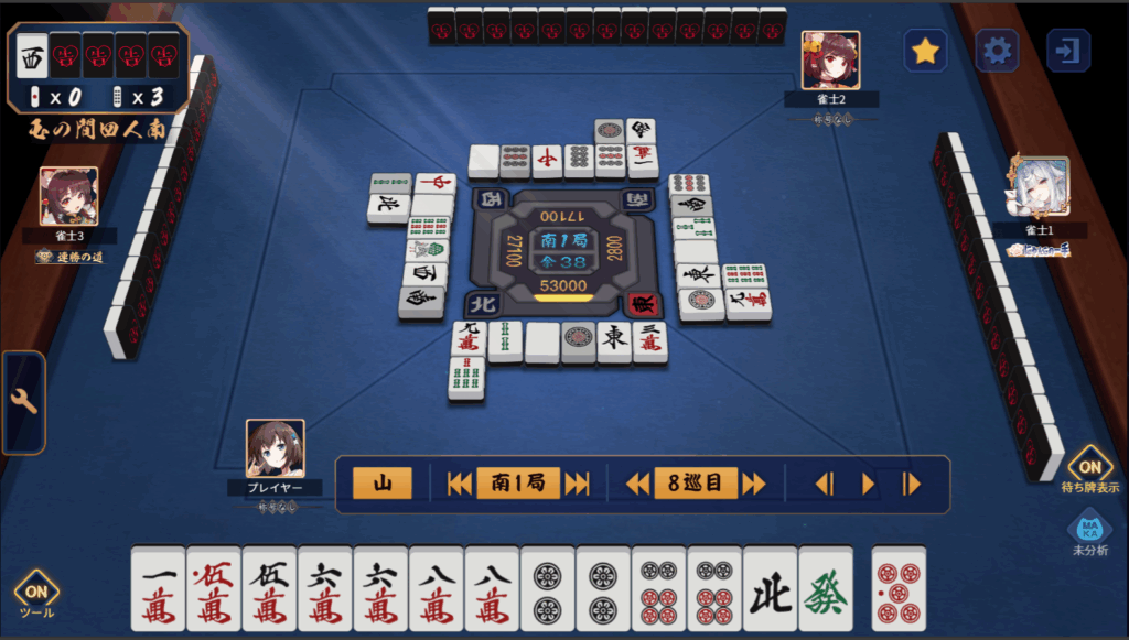 前章で述べたように、チートイツを疑われる捨て牌だからこそ、あえてオタ風牌がリーチ宣言牌の役牌待ちが盲点となり、有効かもしれません。(今回の捨て牌は、チートイツっぽいとは言えませんが…)