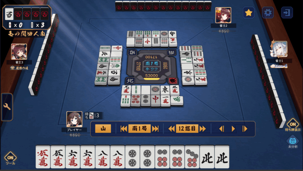 今回のケースは少し特殊で「中」や「發」が「切りづらい牌」になっていましたが、七対子(チートイツ)といえば、待ちはこの三パターンが多いです。